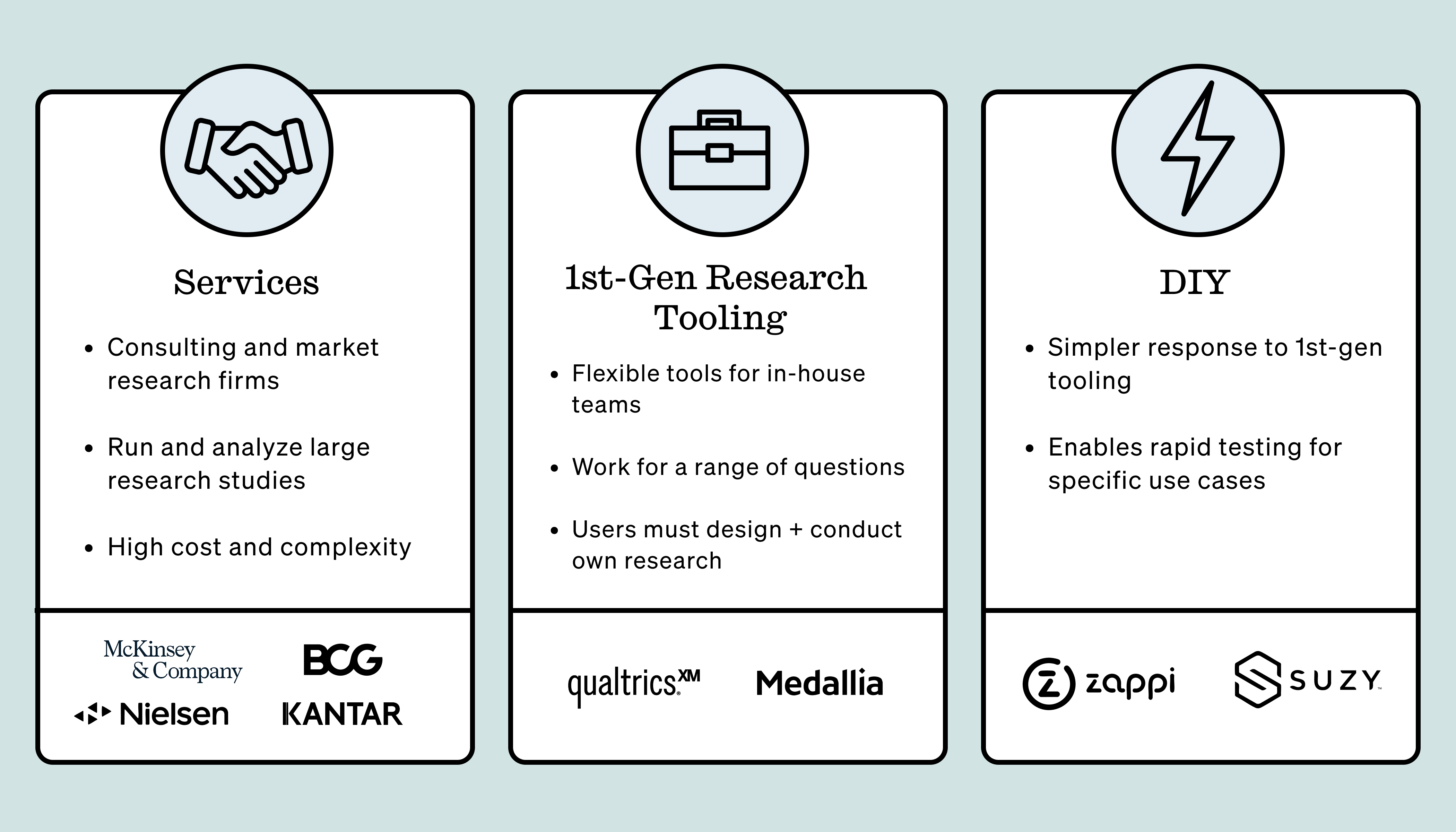 In combination, these two improvements can deliver brands the depth and decision-driving influence of a bespoke research report at the cost and speed of the DIY solutions. We’ve seen three key categories of product innovation emerge that are taking advantage of this fundamental capability shift: