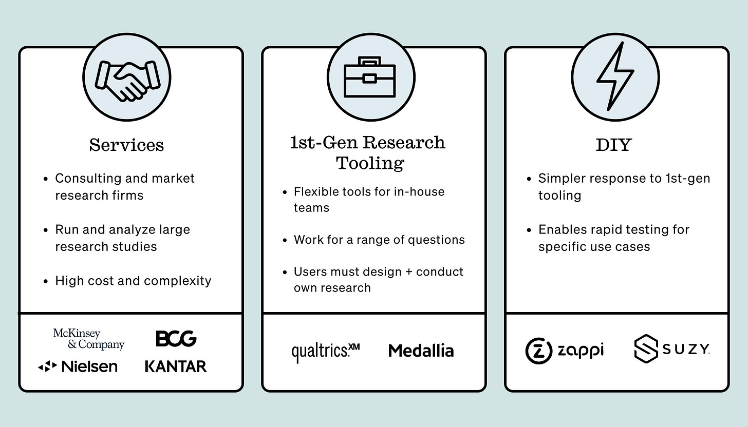 With clear demand for innovation, new entrants can learn from what has made each segment successful, including the depth and actionability of insights from consulting firms / agencies, the mission criticality of research tooling (e.g., used as the survey system of record), and the ease and speed of DIY solutions.